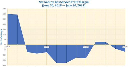 Net profit margins are the portion of revenue left after covering all production costs. For natural gas services, they are often slim. This assumes that profits are even made at all. Since 2019, natural gas services often generate less revenue than they cost (see chart below). This makes natural gas sensitive to the effects of demand (and by extension, prices) dropping significantly. To offset the decreased value, investments in natural gas extractions and storage fell. After all, mining for gas is pointless when the market is oversupplied. This strategy saw success in the short term. By the end of 2020, the natural gas companies balanced supply and demand to eke out a small profit.