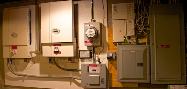 The panels are split into two arrays: one with 19 panels and one with 8. The “big” array (19 panels) feeds a 6500W inverter, while the smaller one feeds a 3000W inverter. The two inverters feed a utility-grade meter for SREC purposes and a web server which monitors the performance of the installation. We have another two-way utility meter mounted on the outside of the house.
