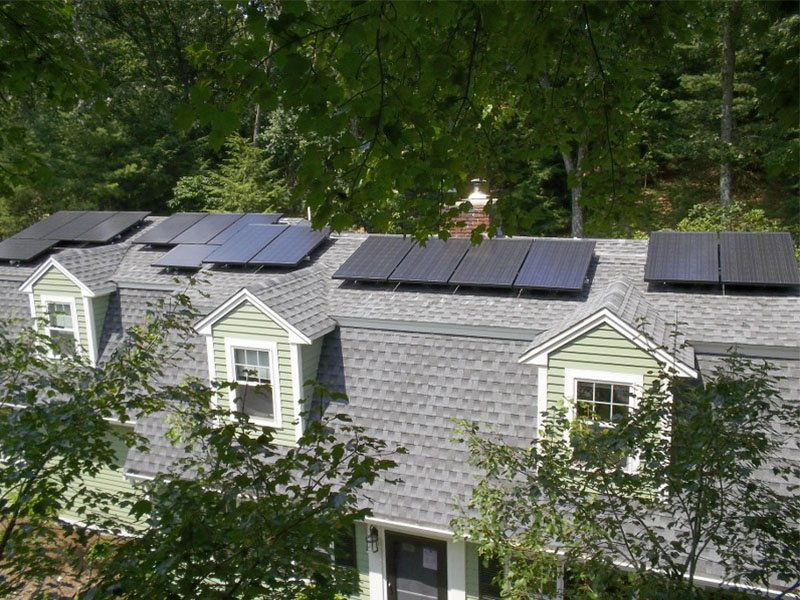 This complicated array has two different configurations of solar panels on two roofs. The 16 Bosch-Aleo panels have the capacity to generate 3,840 watts worth of solar energy.