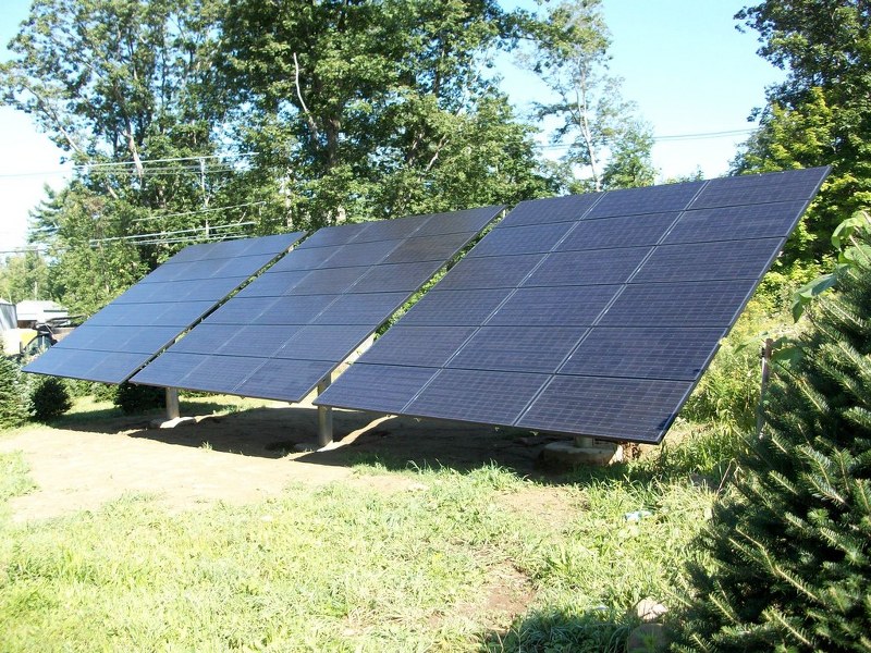 Solar energy systems like this ground-mounted array in Rutland, MA, reduce pollution from fossil-fueled electricity and help improve our environment. This system has 54 Schuco 185-watt panels, Solectria PVI-3000 inverters, and Direct Power & Water “top of pole mounts”.