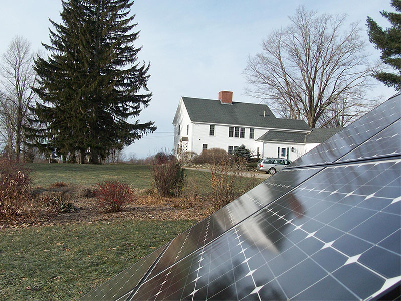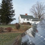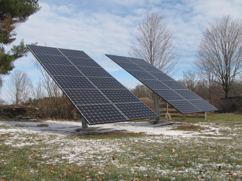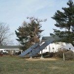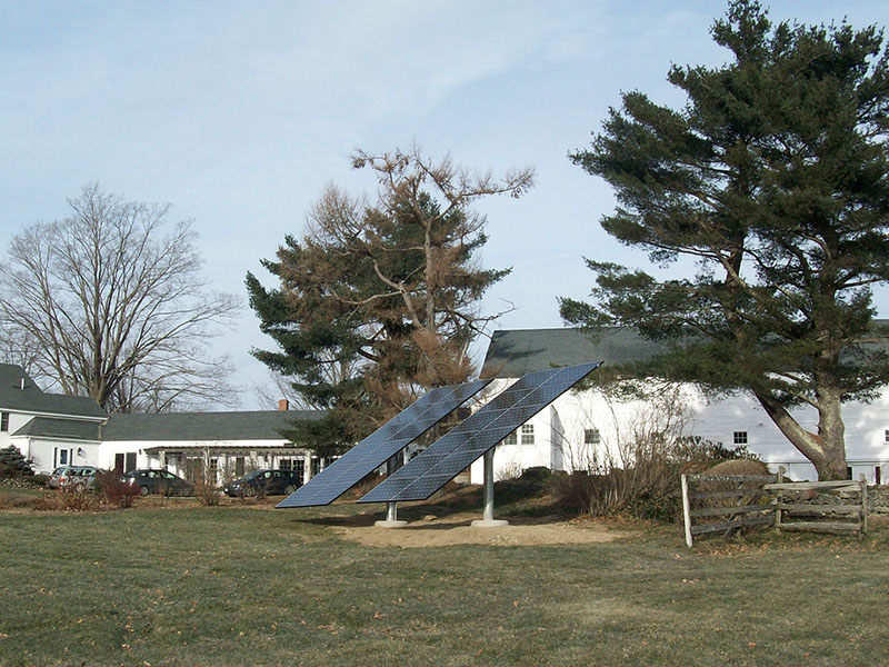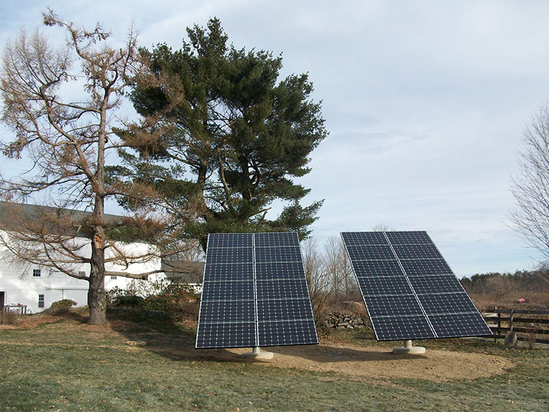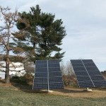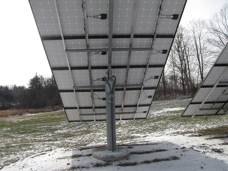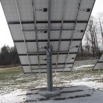 This December 2010 installation has 24 Schuco 210-watt solar panels, a Solectria PVI-5000 inverter, and pole mounts from Direct Power & Water. Ground-mounted systems can be “pole mounted” like this one, or “stadium mounted”.
